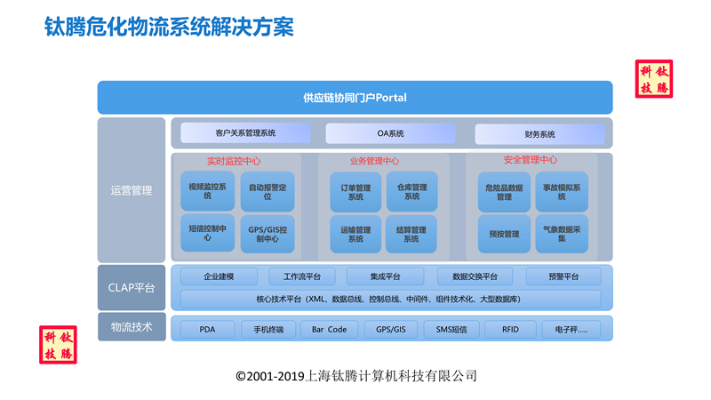 针对危险化物流运作企业现存的问题以及构建统一信息监控平台的基本需求,危化品信息监控平台在建设上应满足平台化和扩展性两项关键指标。平台化是指企业所有信息处理和业务执行必须建立在统一的信息监控平台之上,实现业务管理与安全控制一体化。扩展性则体现在企业内部管理信息系统与外界信息系统的数据交互与信息共享。具体实施中,从业务处理上的延伸,我们可以通过构建企业信息门户(EIP)实现企业价值链的扩展(见图1);从系统功能及信息集成上,可通过定制关键需求及数据接口的形式解决。